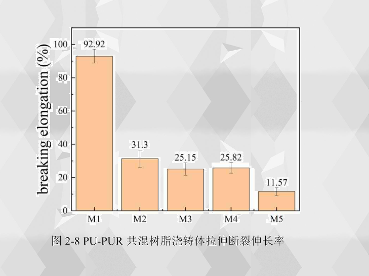 從圖2-8可以看出樹脂澆鑄體的斷裂伸長率隨著聚脲成分的增加而呈現(xiàn)不斷下降的趨勢 。M1聚氨酯具有最高的斷裂伸長率,達到了92.92%。添加了不同程度的聚脲成分導致混合樹脂的硬段含量增加,交聯(lián)密度增大,分子鏈運動更加困難,導致澆鑄體強度增加,呈現(xiàn)出斷裂伸長率顯著下降的趨勢。M2、M3、M4樹脂澆鑄體的斷裂伸長率比較接近,分別為31.30%、25.15%和25.82%,而M5聚脲的斷裂伸長率為11.57%,說明在拉伸載荷下,這三種樹脂澆鑄體相比聚脲可以承受更高的拉伸變形。
