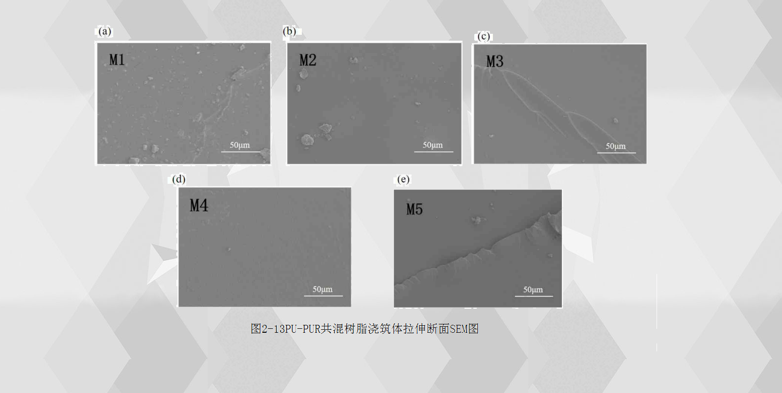 從聚氨酯和聚脲拉伸斷面的SEM圖2-13(a)(e)中看到,兩者的拉伸斷面都表現(xiàn)得較 為平整。其中聚氨酯斷面有很多塊狀顆粒分布在表面,表現(xiàn)出粗糙坑洼不平的現(xiàn)象,聚脲斷面表現(xiàn)得更加平整,兩者都沒有出現(xiàn)分相。從M2,M3和M4拉伸斷面的SEM 圖 2-13(b~d)中看到,斷面光滑而平整,沒有出現(xiàn)分相,說明聚氨酯和聚脲的樹脂共混體系界面相容性很好。