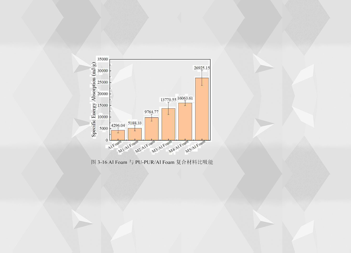 從圖3-16可以看出在泡沫鋁孔洞中填充樹脂后,形成的PU-PUR/Al Foam復(fù)合材料的壓縮比吸能都高于Al Foam,也都高于對應(yīng)的樹脂澆鑄體。Al Foam的比吸能為4296.04mJ/g,而M1/Al Foam的比吸能為5188.33mJ/g, 比Al Foam增加了20.77%。M2/Al Foam的比吸能為9764.77mJ/g,比M1/Al Foam增加了88.20%。M3/Al Foam的比吸能為13770.55mJ/g,比M2/Al Foam增加了41.02%。M4/Al Foam的比吸能為16063.61mJ/g,比M3/Al Foam增加了16.65%。M5/Al Foam的比吸能最高,為26925.15mJ/g,比M4/Al Foam增加了67.61%。從比吸能來看,填充的樹脂中聚脲含量越高PU-PUR/Al Foam復(fù)合材料比吸能越大。